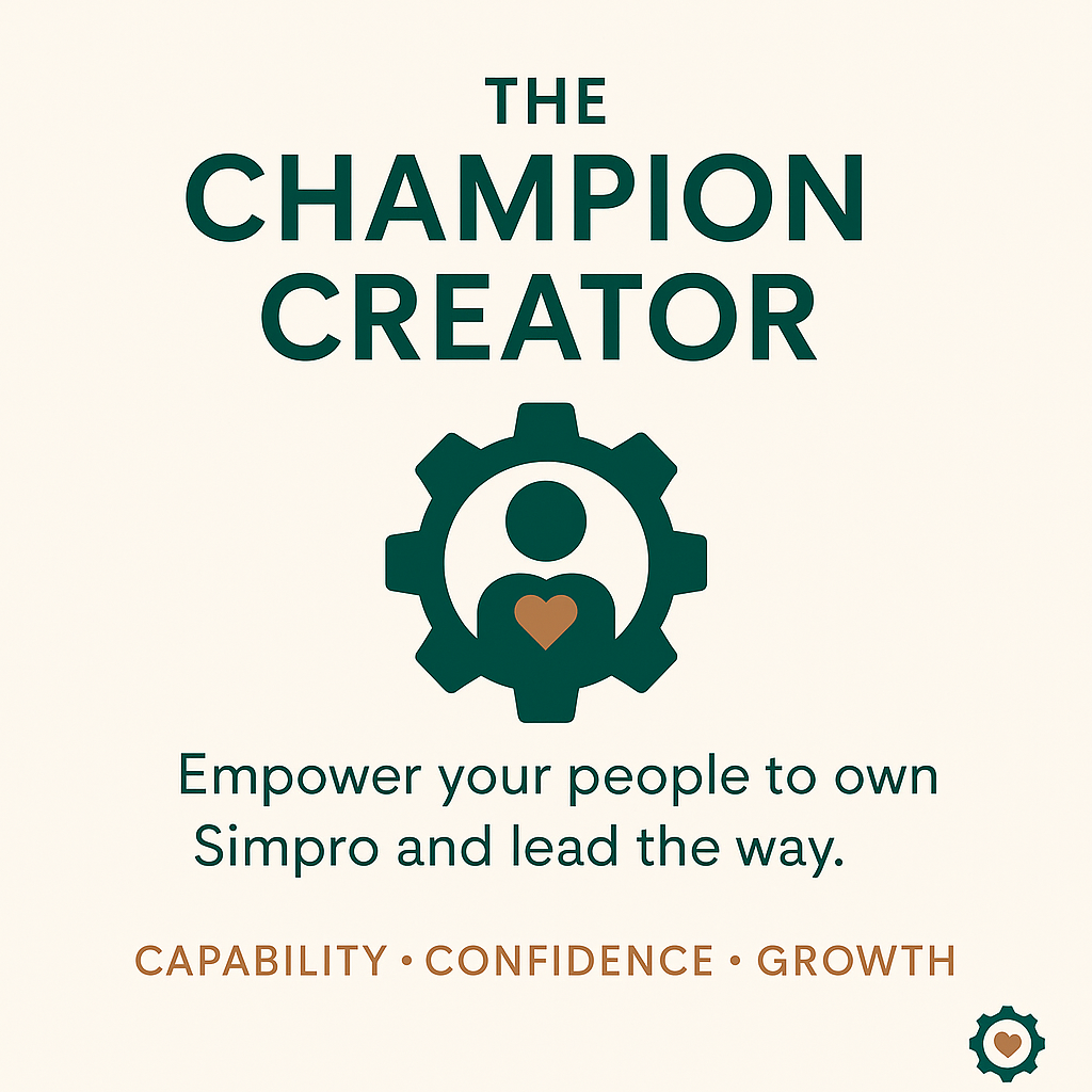 A Simpro Champion is a team member who has the skills and confidence to lead your system internally. I help you create Champions by combining technical Simpro know-how with operational knowledge and leadership skills. This reduces reliance on external consultants and gives your business long-term capability.