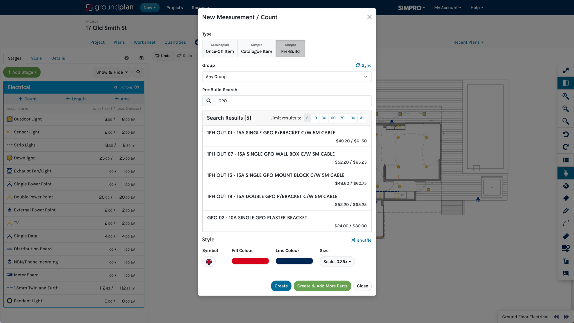 Link Groundplan to your Simpro account and start estimating from plans using your existing Catalogue Items and Pre-Builds. Once you’re done, select a Cost Centre and push your Estimates into a new or existing Simpro Quote.